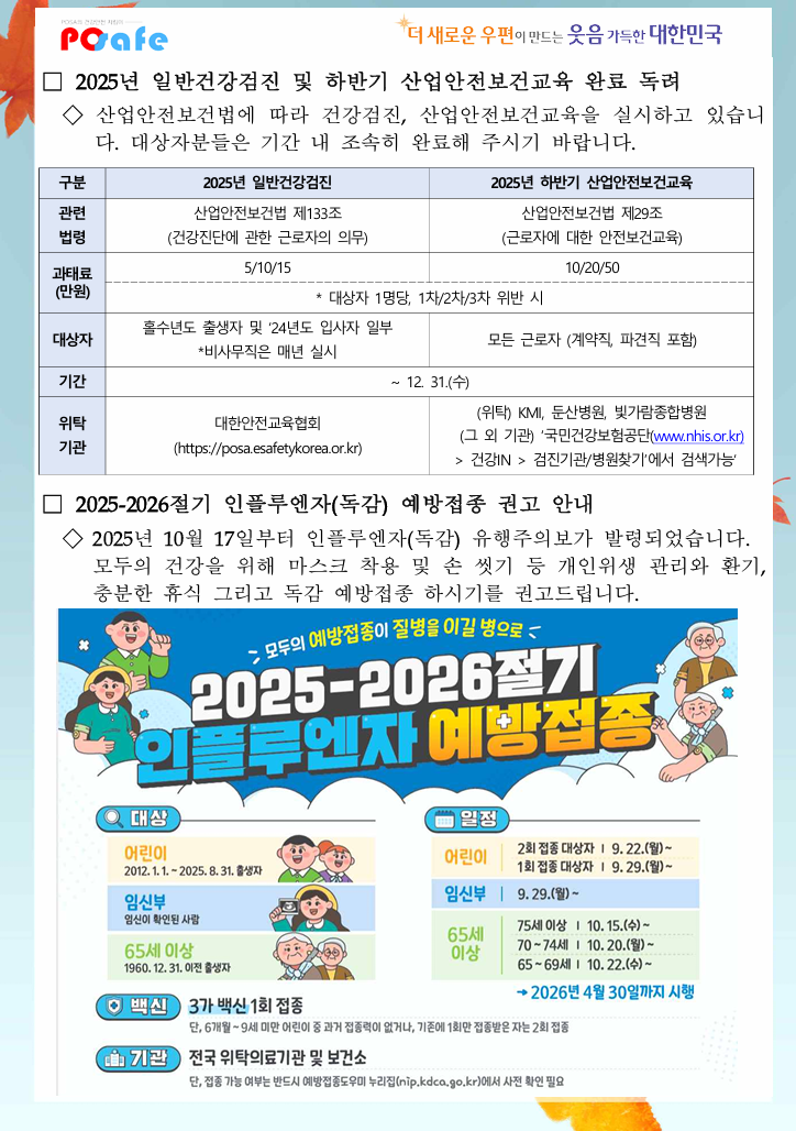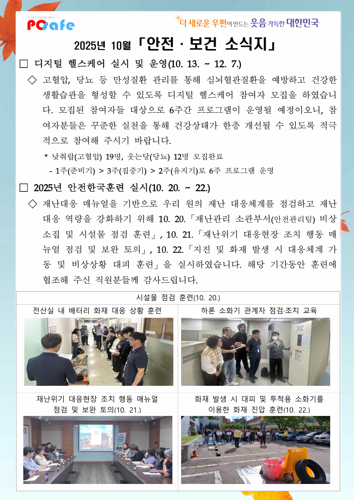 산업안전보건 문화 활성화와 안전의식 제고를 위해 2025년 10월 「안전·보건 소식지」를 발행하였습니다.